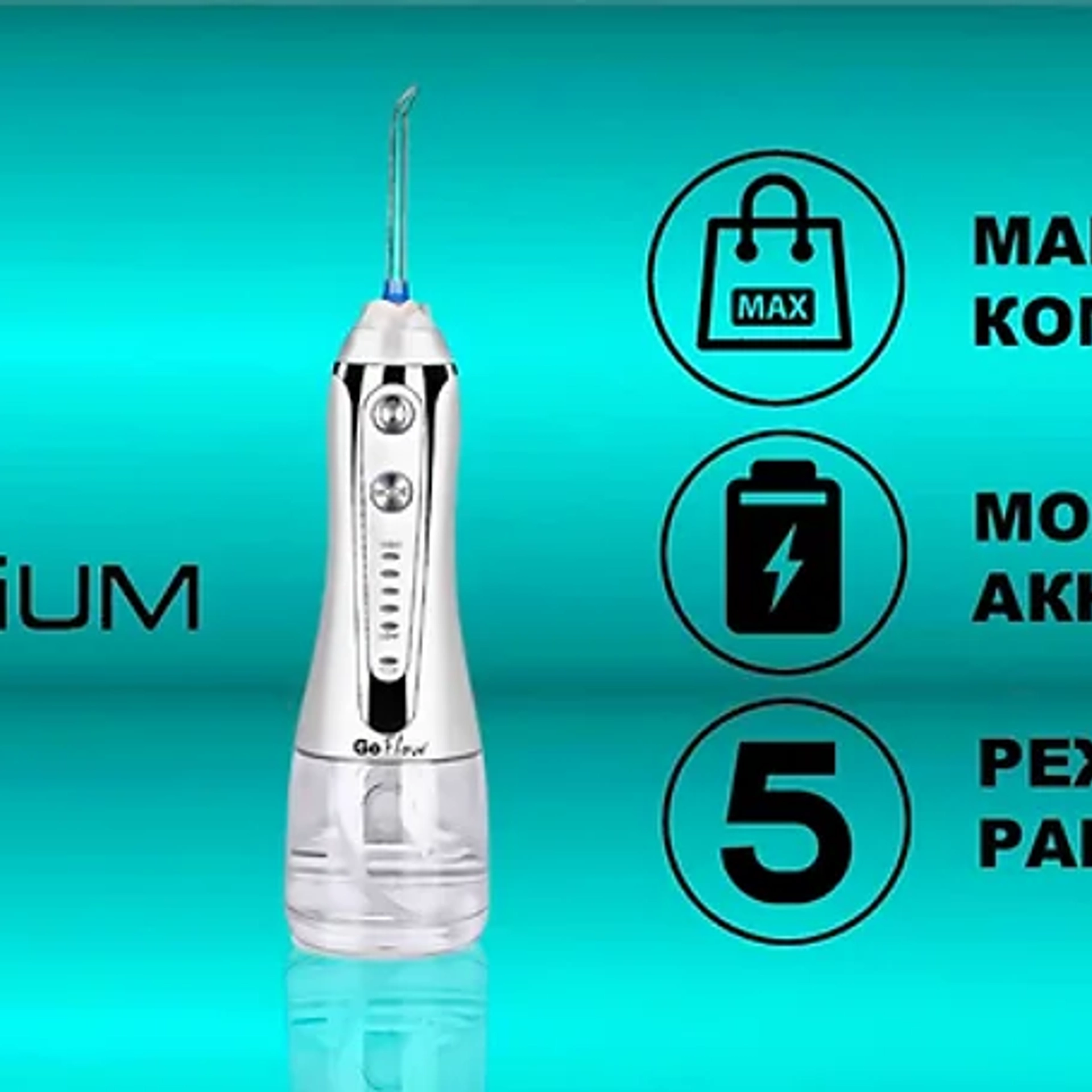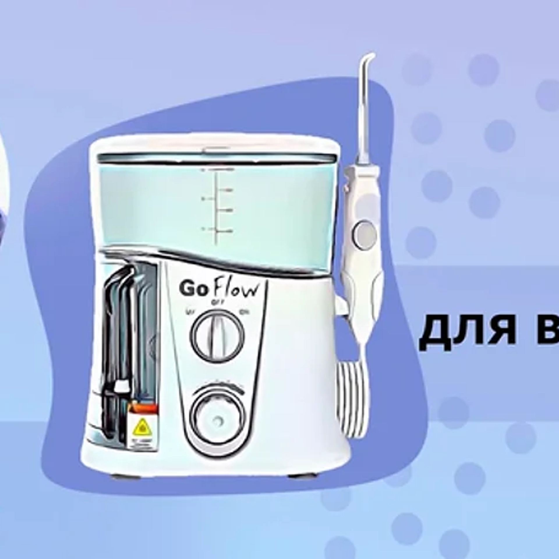 К отличительным особенностям модели GoFlow G-1000 относятся также встроенный ультрафиолетовый обеззараживатель для насадок, бачок 1000 мл, ножки на присосках крепко удерживающие ирригатор. Плавное повышение уровня давления, вращение насадки на 360 градусов и большая, удобная кнопка Пауза, при помощи которой прекращается или возобновляется подача чистящей струи в необходимый момент времени.